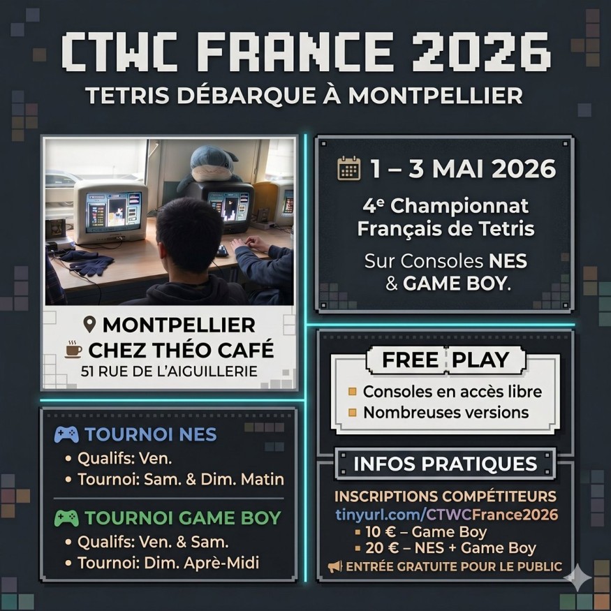 À Montpellier, le championnat du monde de Tetris s’invite au café associatif Chez Théo (51 rue de l’Aiguillerie) les 1er, 2 et 3 mai, pour trois jours de compétition intense et ouverte à tous.