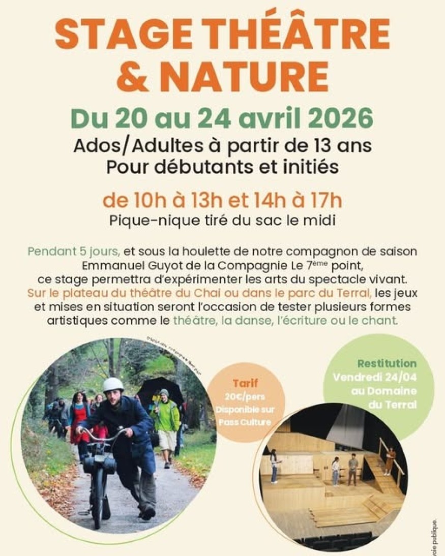 Organisé au Théâtre du Chai du Terral et dans le parc du domaine, ce stage offre un travail complet sur le corps, la voix, l’occupation de l’espace, la transmission des émotions, les sens et l’écriture.