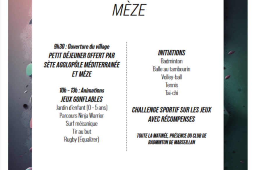 De 9h30 à 13h, sur l’esplanade centrale de Mèze, balle au tambourin, volley-ball, tennis, rugby, badminton, surf mécanique, tai-chi, parcours Ninja et......