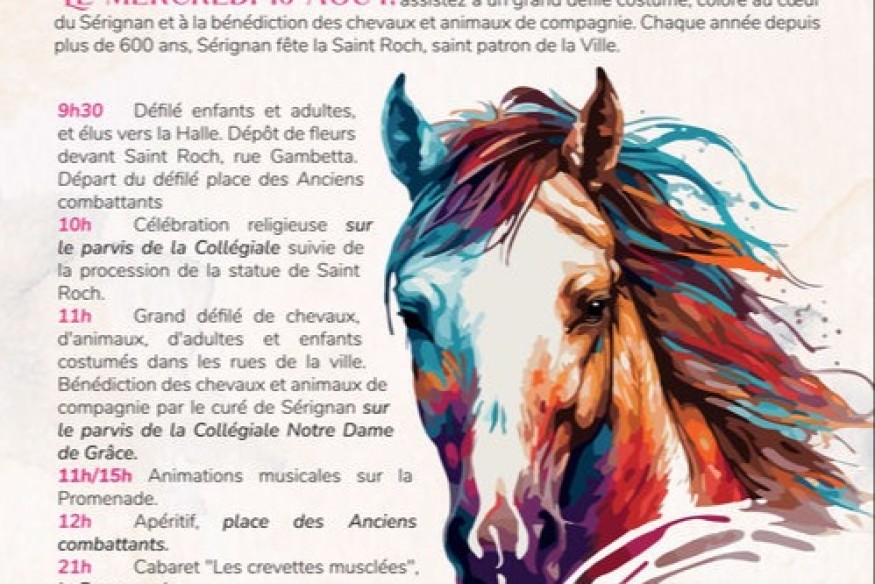 Depuis plus de 600 ans, Sérignan fête la Saint Roch, le Saint Patron de la Ville! Venez assister à un immense défilé costumé et coloré avec une bénédiction des chevaux et animaux de compagnie. A partir de 9h30 des défilés, une célébration religieuse, des animations musicales, un apéritif et un cabaret…une journée festive en perspective