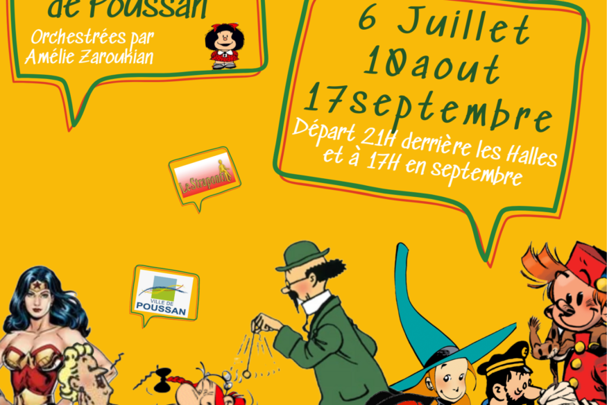 Venez découvrir (ou redécouvrir) Poussan avec une visite guidée théâtralisée !La Compagnie du Strapontin, en partenariat avec le service culturel de la Ville de Poussan, vous emmène dans les rues du Centre Historique de notre village.Son histoire vous y sera présentée par des personnages de Bandes Dessinées !!!