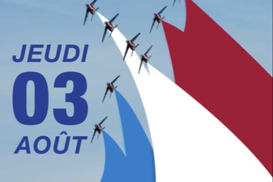 Jeudi 3 Août:– Le matin : Reconnaissance de l’axe et entraînements de la Patrouille de France– Stands sur la promenade de la plage de l’Hôtel de ville : stand de la Patrouille de France, club Aéro des Garrigues (Réplique du Blériot XI), ADAM (Anciens Mécaniciens de la Patrouille de France), GUEUGNON (vente d’articles liés à l’aviation), B.I.A (Rectorat, Brevets d’Initiation Aéronautique), CIRFA Air, stand......