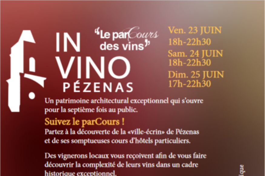 « In Vino Pézenas, le « ParCours des vins » 7ème édition du vendredi 23 au dimanche 25 juin conjugue avec passion les meilleures cuvées des vignerons régionaux avec l’art et le patrimoine, Le parcours de découverte œnotouristique dans le centre historique de Pézenas permet de découvrir une sélection des domaines viticoles réunie dans les plus belles cours d’hôtels particuliers, ouvertes exclusivement pour l’occasion.
