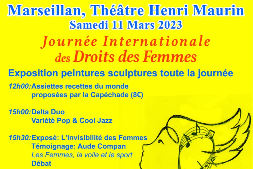 La journée Internationale des Droits des Femmes à au Théâtre Henri MAURIN à Marseillan construite par le Collectif ELLES c'est le samedi 11 mars avec pour thème: l'invisibilité des femmes.