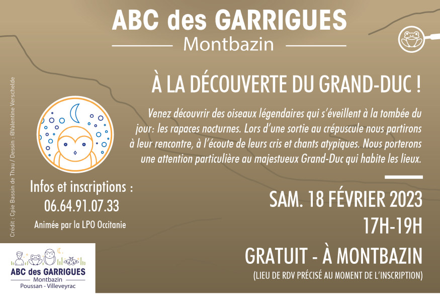 Samedi 18 février de 17h à 19h, partez à la découverte des rapaces nocturnes et plus particulièrement du Hibou Grand-Duc qui habite les lieux de Montbazin.