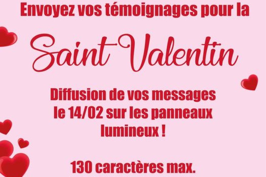 Envoyez votre message (130 caractères maximum, espaces compris) pour la Saint-Valentin avant le 12/02 à l’adresse mail suivante : communication@ville-pezenas.fr.