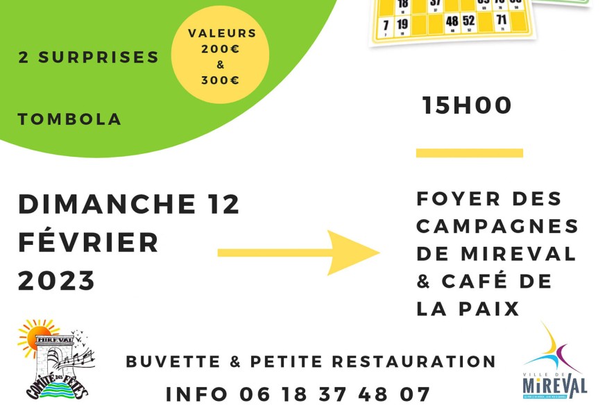Le loto de l'Amicale de l'école le Chêne Vert et une grande tombola auront lieu le samedi 11 février à 14h00 au centre socio-culturel Nelson Mandela.