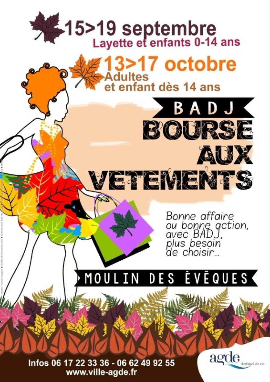 L’association BADJ organise une bourse aux vêtements du lundi 13 au vendredi 17 octobre 2025 au Moulin des Evêques, avenue du 8 Mai 1944 à Agde.