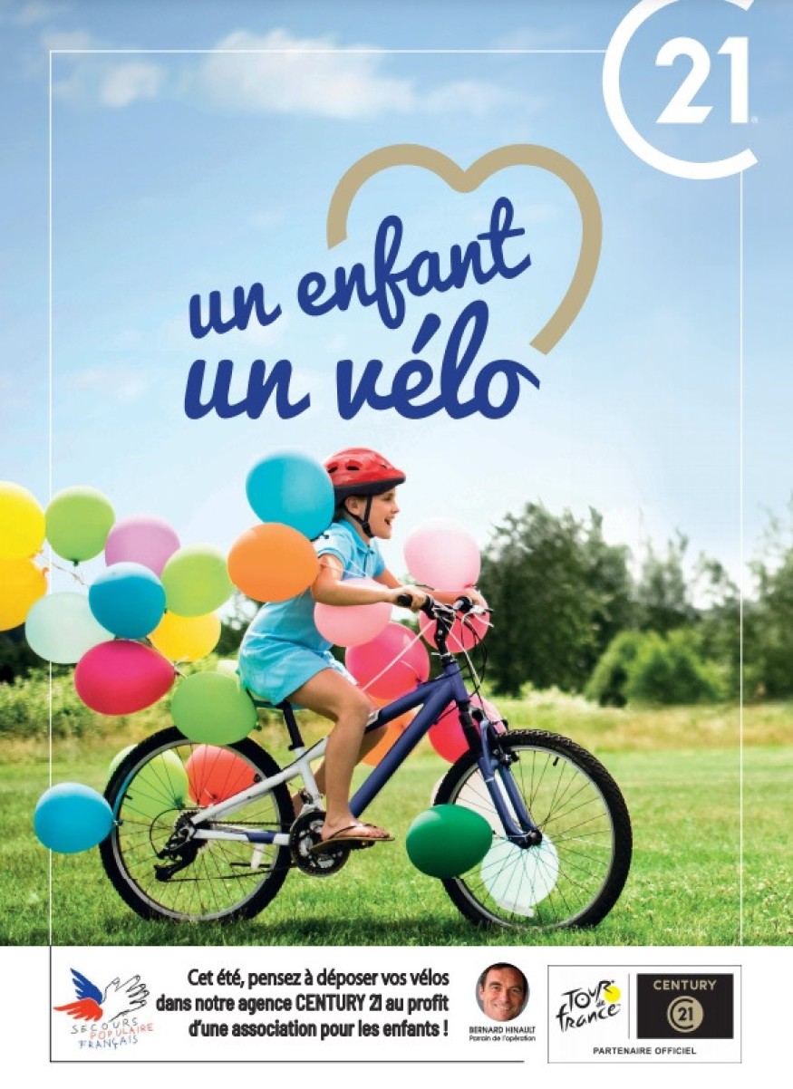 Pour soutenir cette opération, le quintuple vainqueur du Tour de France, Bernard Hinault, a accepté d’en être le parrain : « L’opération Un enfant, un vélo créée par CENTURY 21 il y a maintenant 7 ans me tient particulièrement à cœur. On récupère les vélos qui dorment dans les garages pour les filer à des mômes dont les parents n'ont pas les moyens d'en acheter un. C'est génial. Avoir un vélo est le rêve de n’importe quel gosse et je sais personnellement à quel point cela peut faire briller leurs yeux. Et, qui sait, peut-être que cette opération suscitera des vocations et qu’un jour, l’un de ces enfants montera sur le podium du Tour de France ? ».