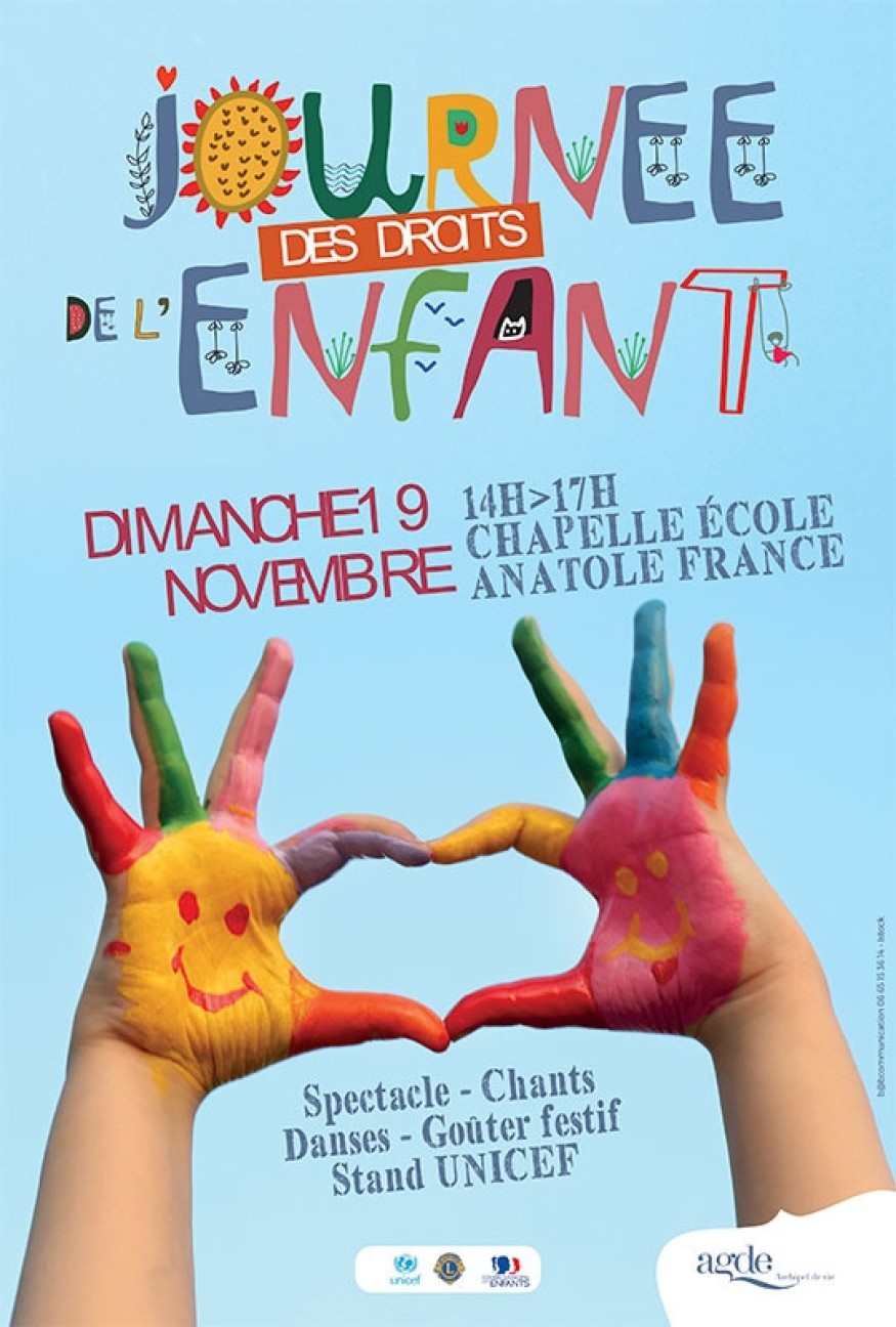 Dimanche 19 novembre Dans le cadre de la journée des droits de l’enfant, la direction de l’éducation de la Ville d'Agde avec les élèves des écoles élémentaires, en partenariat avec Le Lion's Club, proposent de nombreuses animations à la Chapelle de l'école Anatole France à partir de 14h00.