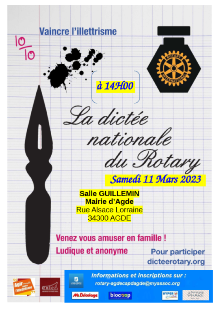 Dans le cadre de la lutte contre l’ illettrisme, le Rotaru Agde Cap-D'Agde organise « La dictée nationale du Rotary »samedi 11 mars à 14h dans la salle Guillemin de la Mairie d’Agde, rue Alsace Lorraine