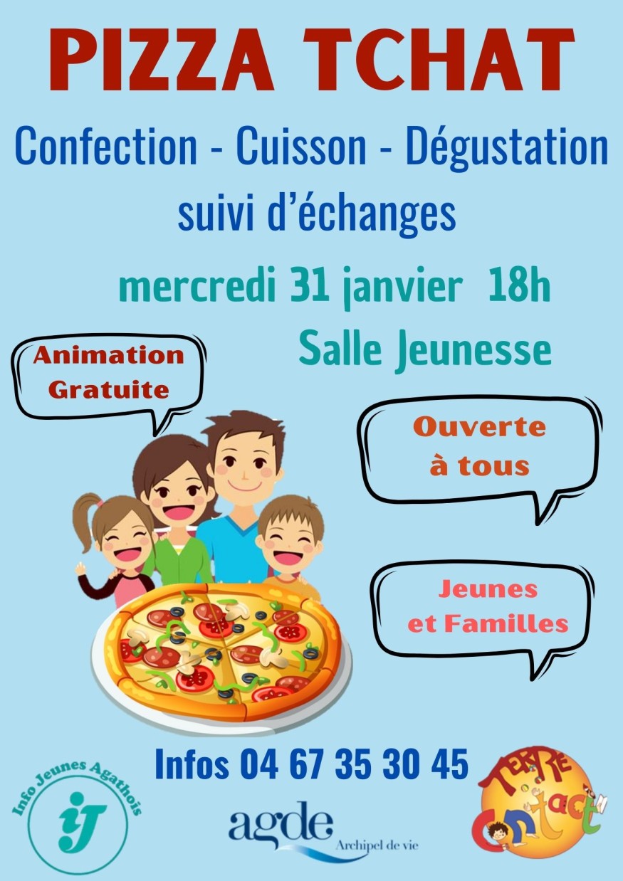 La Direction Cohésion Sociale et Jeunesse de la ville d’Agde invite les habitants à participer à l’événement “Pizza Tchat”. Une soirée délicieusement conviviale pour partager des moments d’échanges et de discussions autour de délicieuses pizzas.