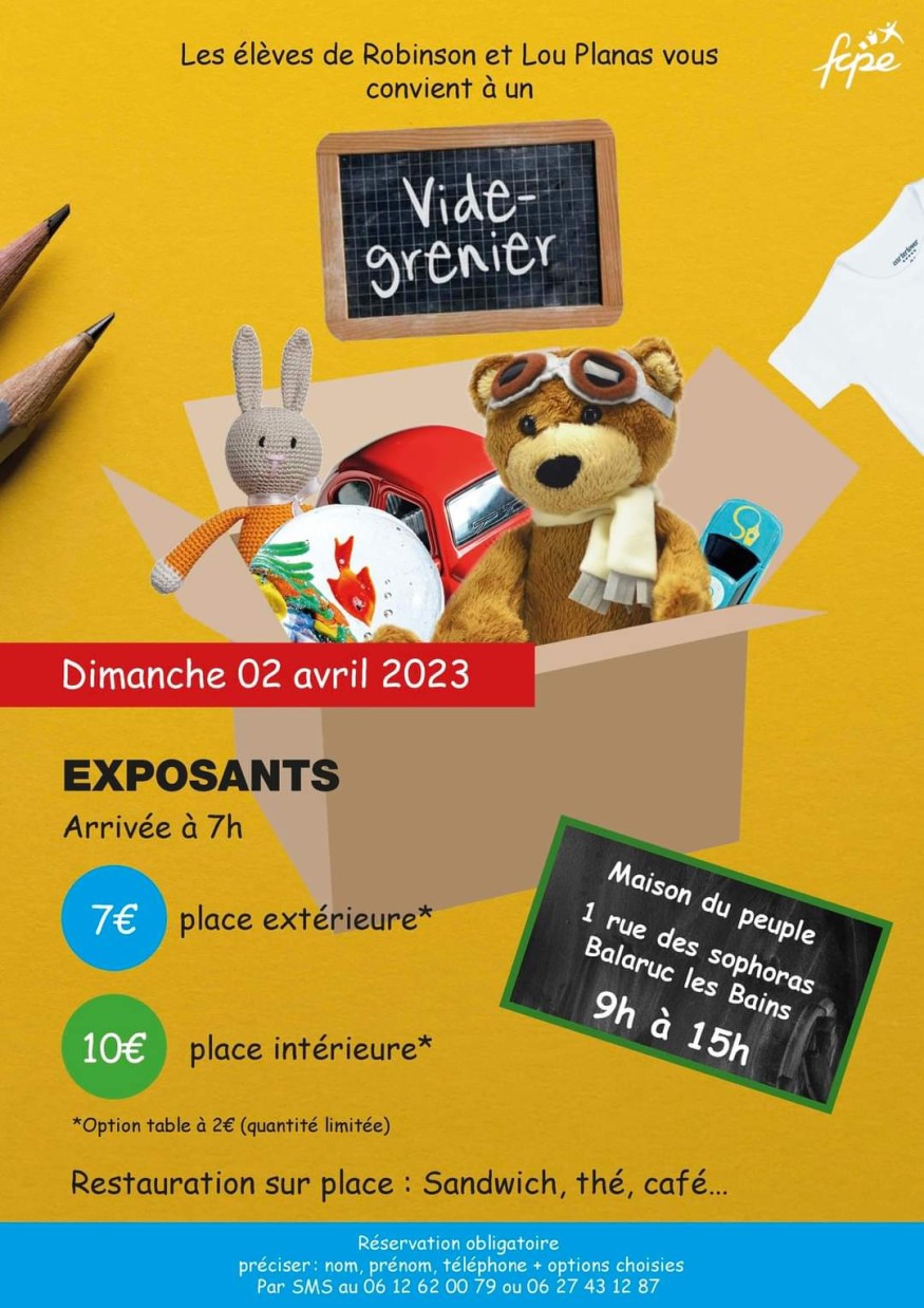 Le dimanche 2 avril 2023 les parents d'élèves des écoles Robinson et lou Planas organisent un vide grenier de 9h00 à 15h00 à la Maison du peuple de Balaruc-les-Bains.