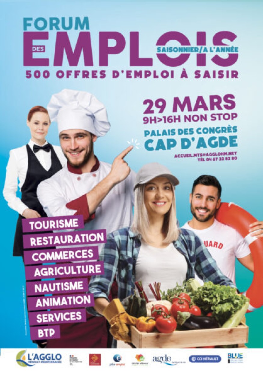 L’Agglo Hérault Méditerranée organise le forum des emplois le Mercredi 29 mars 2023, de 9h à 16h, au Palais des Congrès du Cap d’Agde.