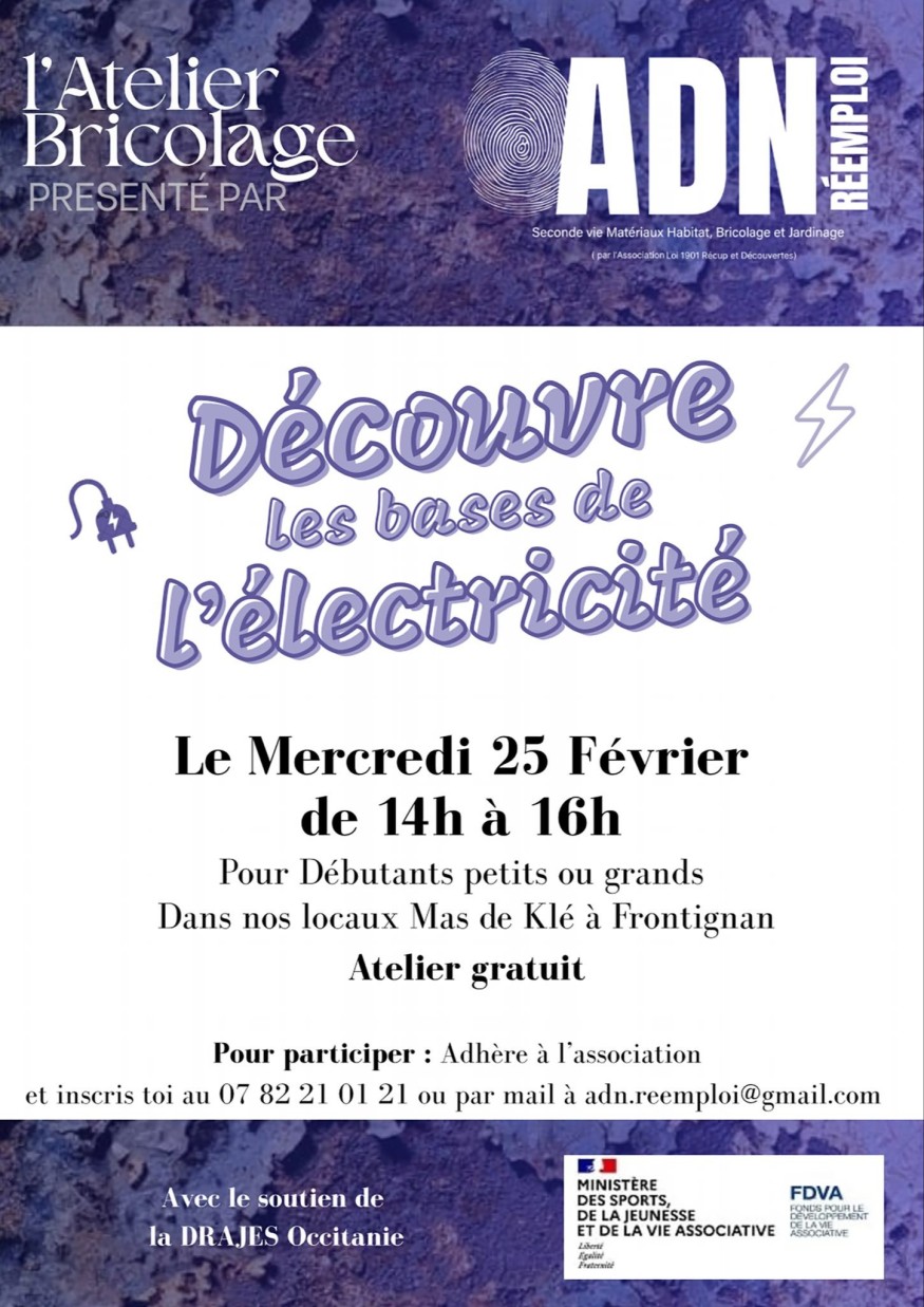 Mercredi 25 février 2026, de 14h00 à 16h00, venez apprendre les fondamentaux de l’électricité lors d’un atelier pratique et ludique pour tous les âges, proposé par ADN Réemploi.