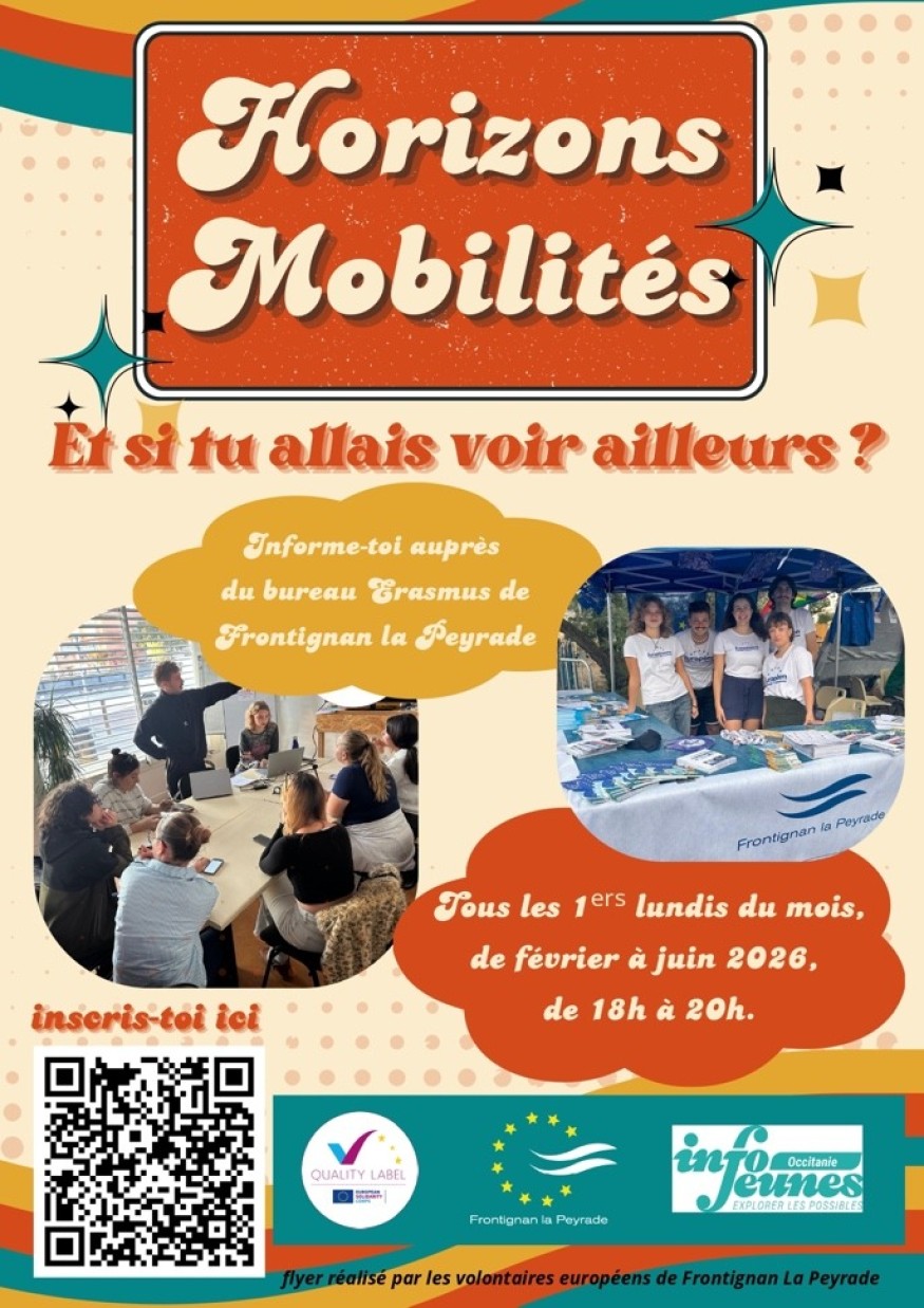 La Ville de Frontignan la Peyrade lance Horizon Mobilité, un rendez-vous mensuel dédié aux jeunes de 16 à 30 ans qui souhaitent concrétiser un projet de mobilité européenne (volontariat, études, stages, échanges…).