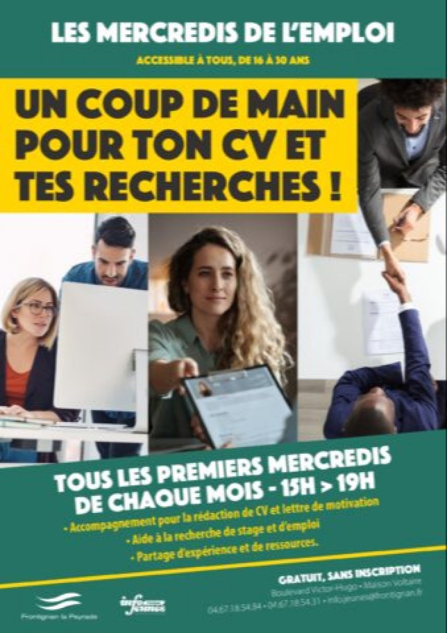 En avril, les mercredis de l’emploi débutent à Frontignan la Peyrade CV, lettre de motivation, entretien d’embauche, parcours professionnel : le Point Infos Jeunes se met en quatre pour aider les jeunes dans leur recherche d’emploi chaque premier mercredi du mois. Les mercredis de l’emploi sont conçus comme des sessions d’accompagnement à la recherche d’emploi pour les jeunes Frontignanais et Lapeyradois âgés de 16 à 30 ans.