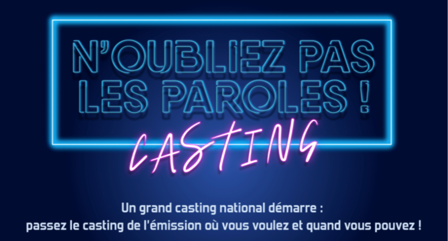 Un grand casting national démarre : passez les sélections de l’émission où vous voulez et quand vous pouvez ! Et si vous deveniez vous aussi le prochain Maestro de « N’Oubliez Pas Les Paroles !! » comme Margaux, Renaud ou plus récemment Charlotte ou Laurens, sans sortir de chez vous ? Alors, si vos amis vous surnomment le « jukebox », si vous faites de votre douche l’Olympia et de votre voiture le Stade de France, si vous avez envie de vivre une expérience inoubliable avec des musiciens en live et peut-être gagner jusqu’à 20 000€ par émission, inscrivez-vous !