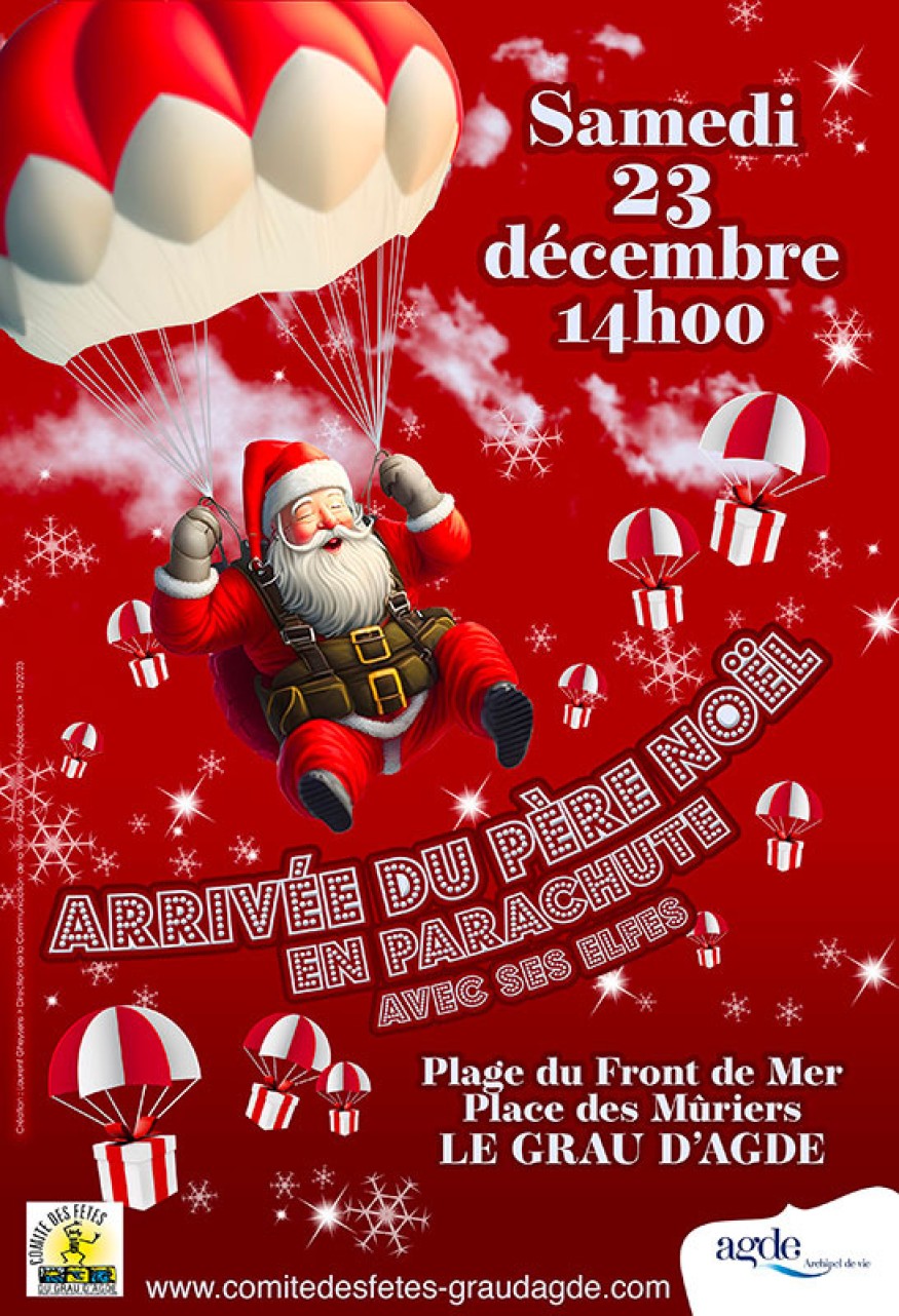 Le Père Noël fera une halte au Grau d’Agde avec une arrivée rocambolesque en parachute sur la plage du Front de Mer.
