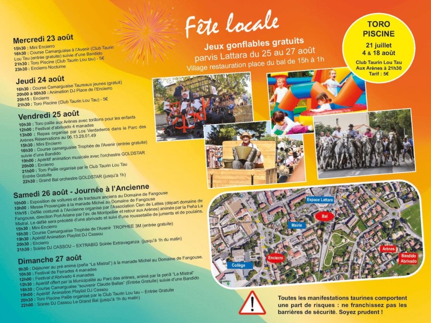 Au programme: Encierro, Courses camarguaises, Toro piscine, abrivado, grand bal, exposition de voitures et de tracteurs anciens, défilé costumé…