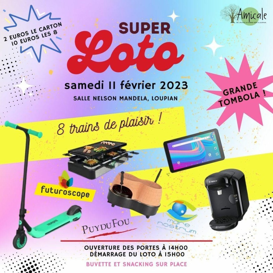 Le loto de l'Amicale de l'école le Chêne Vert et une grande tombola auront lieu le samedi 11 février à 14h00 au centre socio-culturel Nelson Mandela.