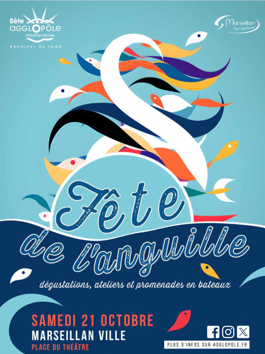 Cette manifestation conviviale se tient depuis 2015 à Marseillan. La 8ème édition se tiendra le samedi 21 octobre 2023 sur la Place du Théâtre et met à l’honneur une espèce typique de notre territoire et pourtant fort méconnue, l’anguille.