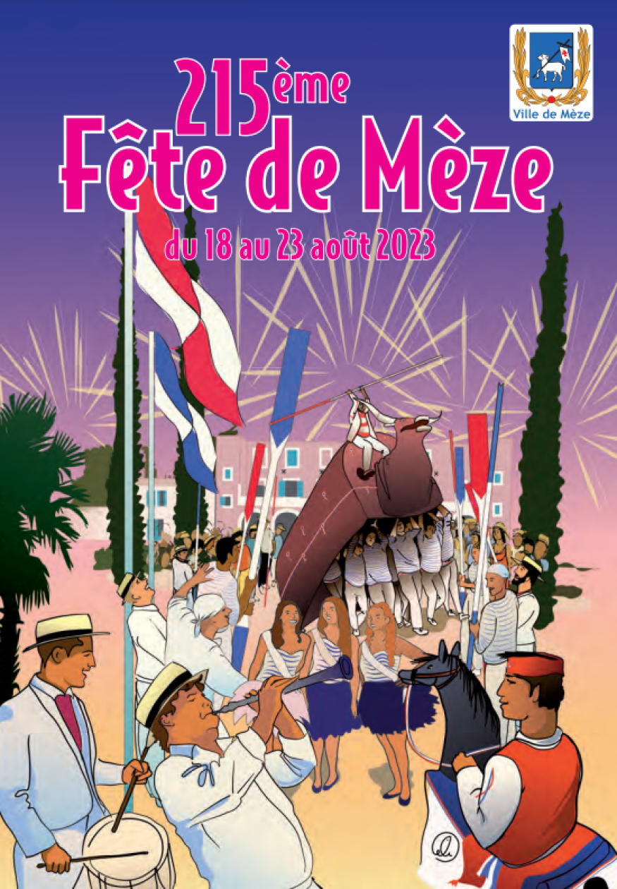 La 215e Fête de Mèze se déroulera du 18 au 23 août 2023. Le Bœuf, commence à gratter le sol du sabot, le Chevalet peaufine sa chorégraphie, la bigue se savonne, les jouteurs affûtent leurs lances, les fanfares répètent leurs couacs et les fêtards rongent leur frein…