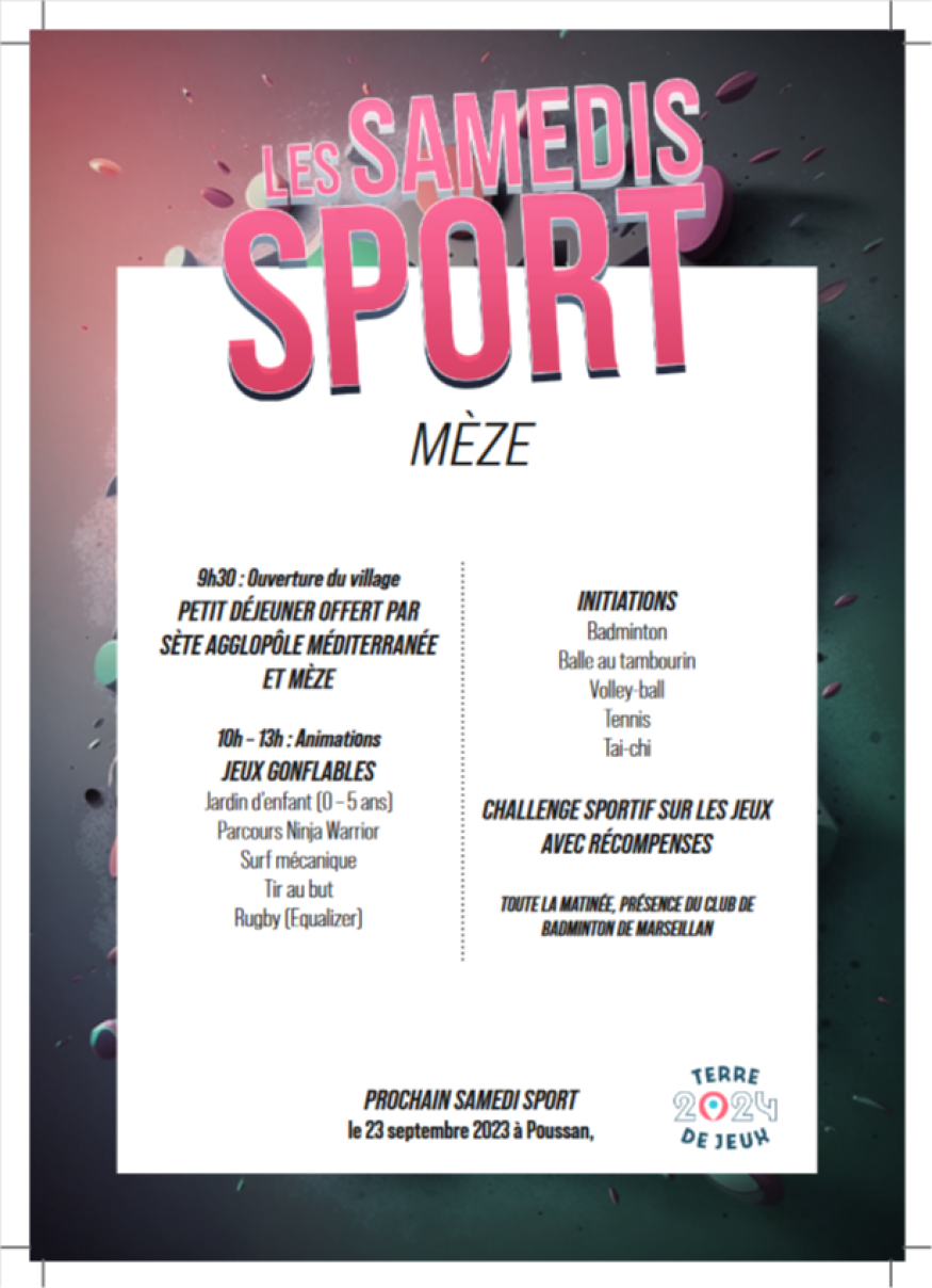 Mèze d'accueillir les "Samedis du Sport", le samedi 26 août, sur l'Esplanade (place centrale). Il s’agit d’une matinée gratuite et ouverte à tous, de 7 à 77 ans, qui se déroule une fois par mois dans une commune du territoire et propose la pratique de différents sports. L’objectif est de faire vivre l'esprit du sport et encourager à la pratique sportive dans une ambiance conviviale.