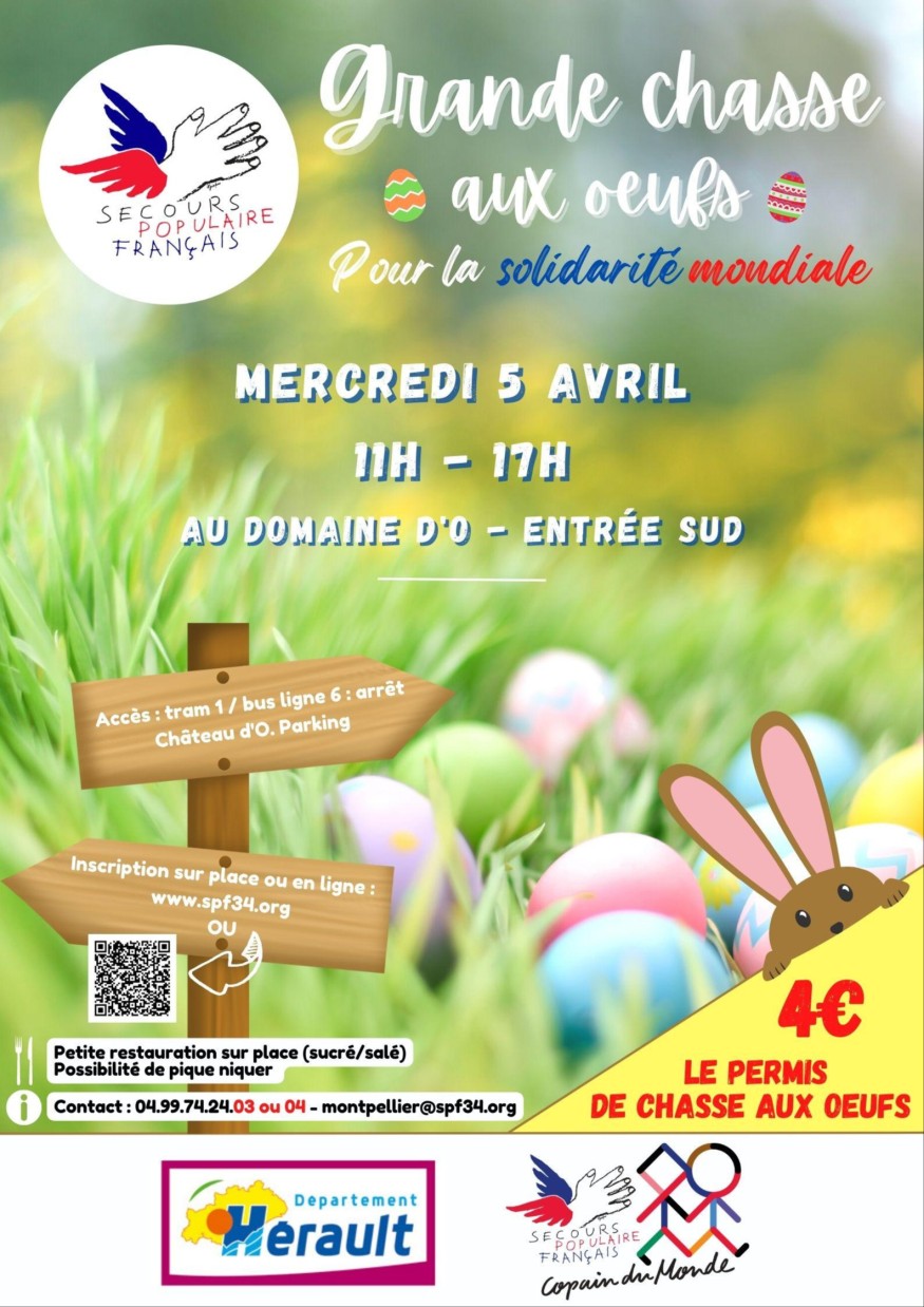 Comme chaque année, le Secours populaire de l'Hérault organise une grande chasse aux œufs solidaire le mercredi 5 avril 2023 au Domaine d'O à Montpellier. (Entrée sud) Inscription fortement conseillée en ligne sur Helloasso => https://bit.ly/3lMoals