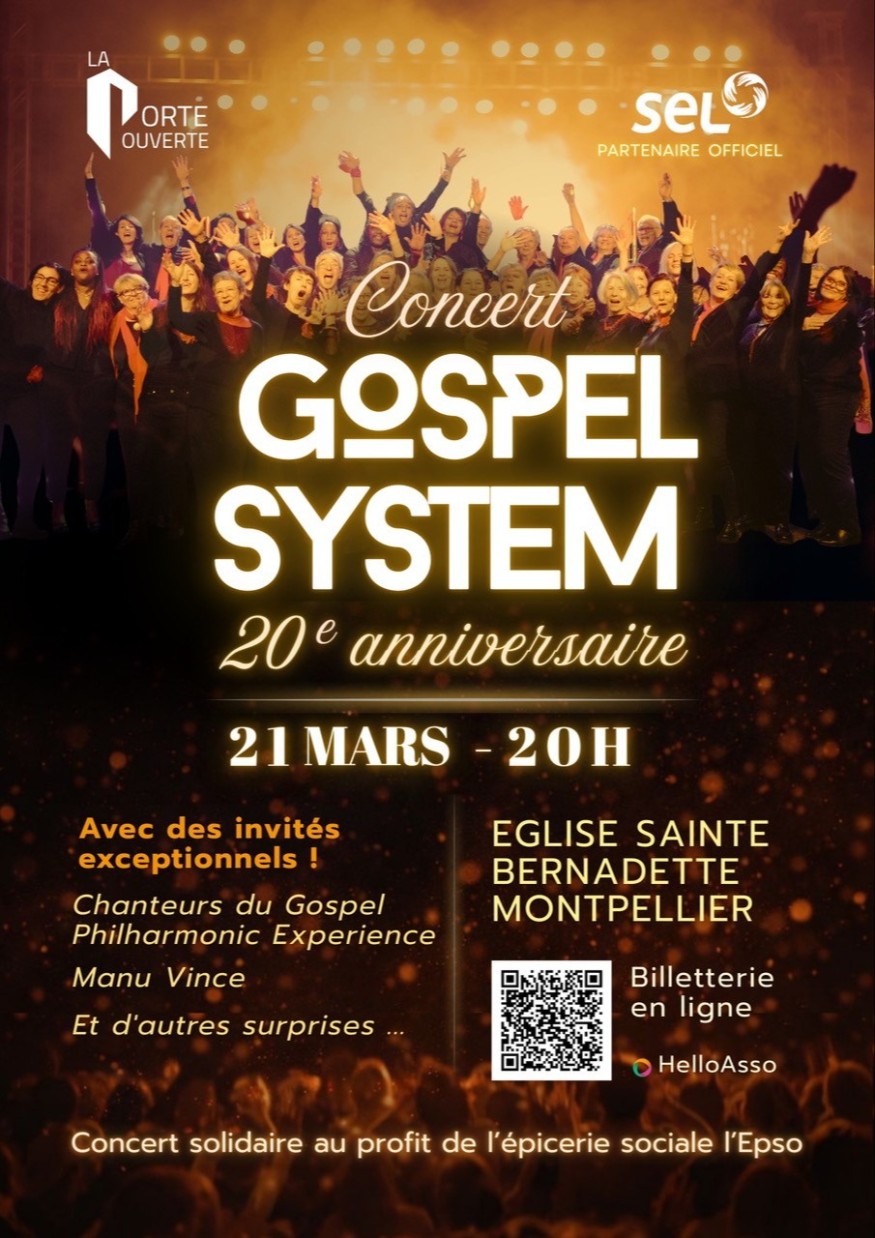 Billetterie : https://www.helloasso.com/associations/la-porte-ouverte-2/evenements/20-ans-de-gospel-system