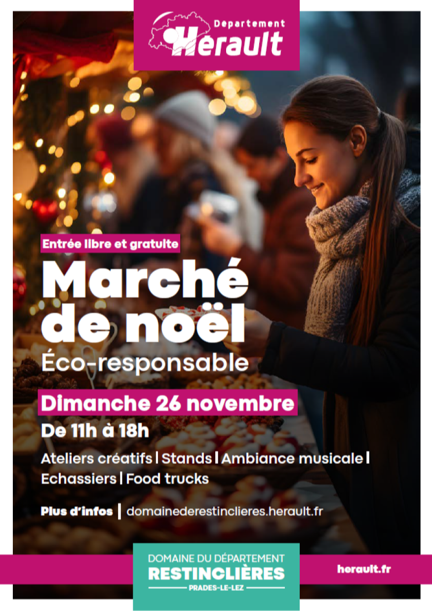 Le Département de l’Hérault accueillera la première édition de son marché de Noël écoresponsable, ce dimanche 26 novembre de 11 h à 18 h sur le parvis du château de Restinclières. Le marché se déroulera sous chapiteau.
