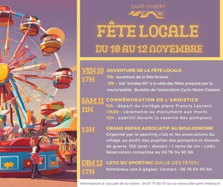 La fête locale de Saint-Thibéry se déroulera du 10 au 12 novembre. La fête foraine est installée au cœur du village autour de la mairie