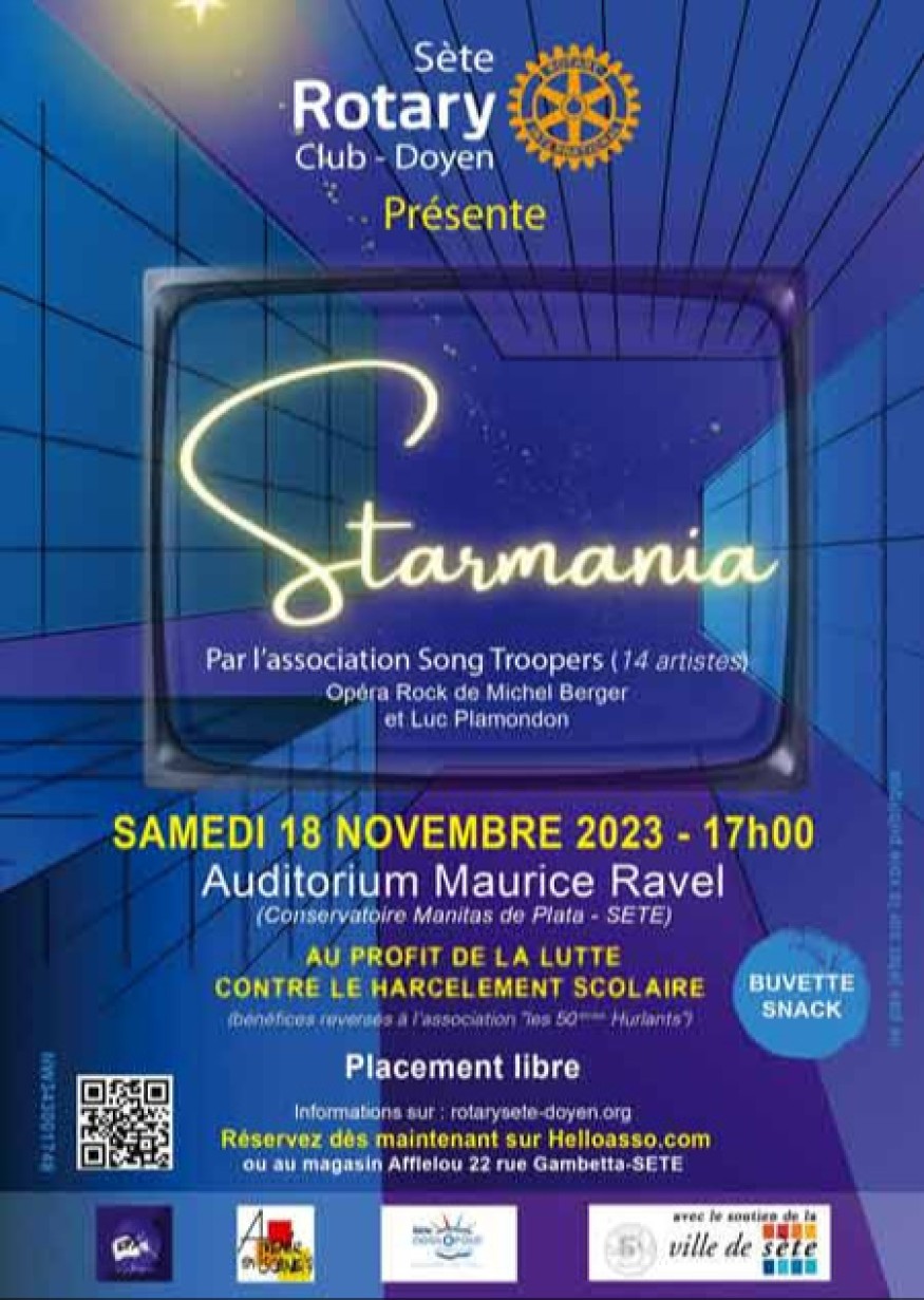 Samedi 18 novembre, à 17 h, le Rotary club doyen de Sète organise la venue du spectacle Starmania interprété par la troupe de l’association Song Troppers au conservatoire Manitas-de-Plata. Les quatorze chanteuses et chanteurs qui la composent vont reprendre cet opéra rock créé par Michel Berger et Luc Plamondon en 1978. Les Song Troppers assurent rechercher « les émotions originelles » d’une écriture « si en avance sur son temps qu’elle n’a finalement pas été immédiatement appréciée par la critique malgré son succès auprès du public ». Cette représentation sera donnée au profit de l’association Les Cinquantièmes hurlants qui se produit dans les établissements scolaires du bassin de Thau pour sensibiliser les élèves mais aussi leurs accompagnants (professeurs, éducateurs, parents) au harcèlement scolaire par le biais d’un mini spectacle participatif. Le but de cette pratique est d’éveiller les consciences, d’ébranler certaines certitudes et de soulever un débat.