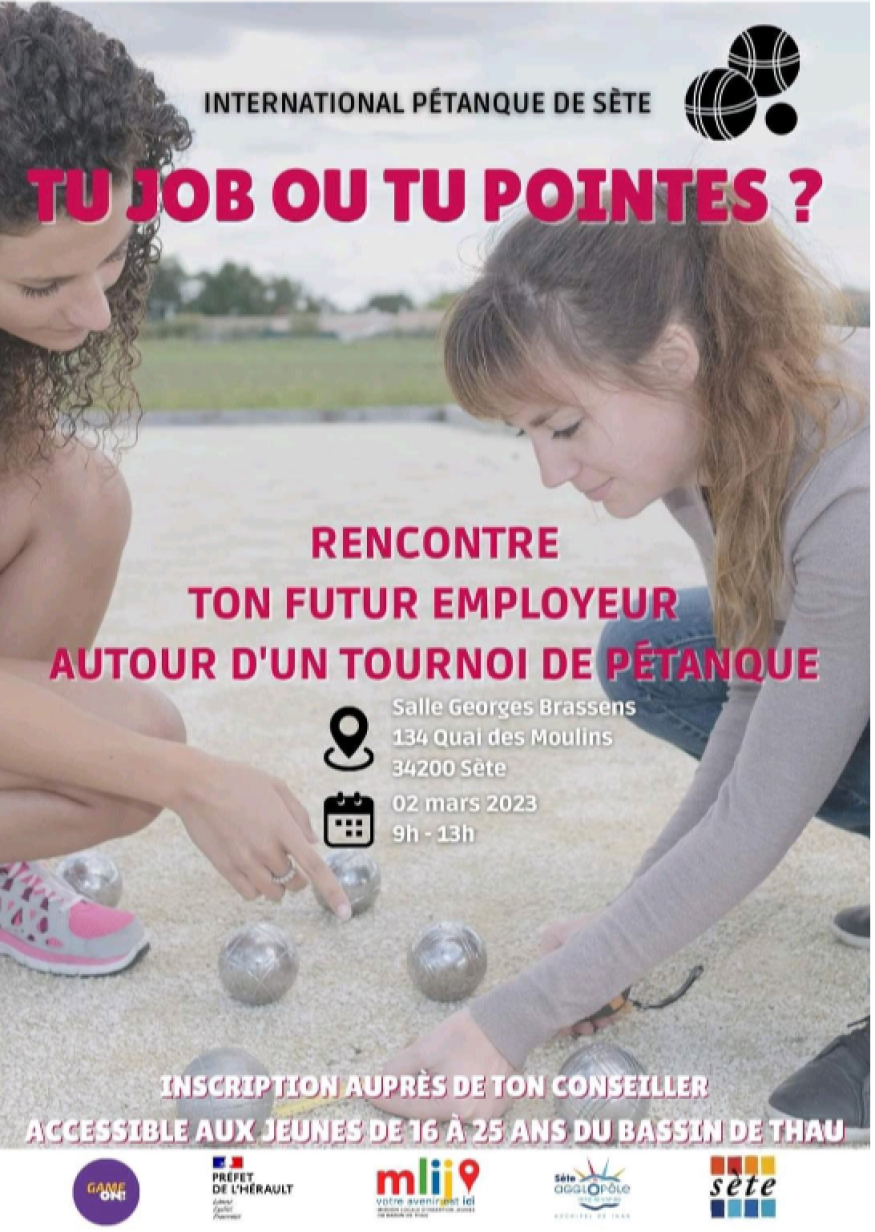 Si vous avez entre 16 et 25 ans et que vous êtes désireux de mêler pétanque et emploi, c’est possible. Dans le cadre de l’international de pétanque de Sète, venez défier votre prochain employeur dans un tournoi survolté à la salle Georges Brassens, samedi 2 mars.
