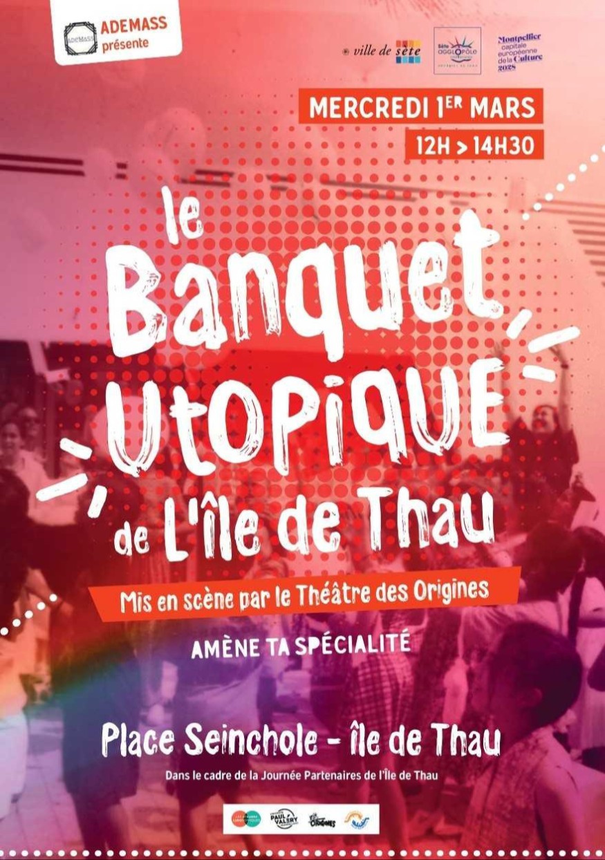 A l’occasion de la Journée Partenaires de l’île de Thau, la Ville de Sète et Sète Agglopôle Méditerranée, en partenariat avec l’association Ademass, propose de fêter ensemble nos cultures culinaires, festives et solidaires, à travers un « banquet utopique », un banquet-spectacle orchestré par le Théâtre des Origines, ce mercredi 1er mars, de 11 h 30 à 14 h 30, sur la place Seinchole de l’île de Thau.
